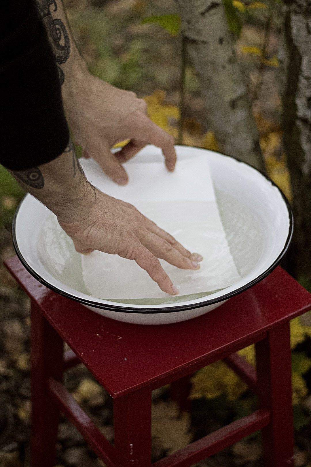 6. Wkładamy wysokiej jakości papier do kuwety z wodą, musi się namoczyć.