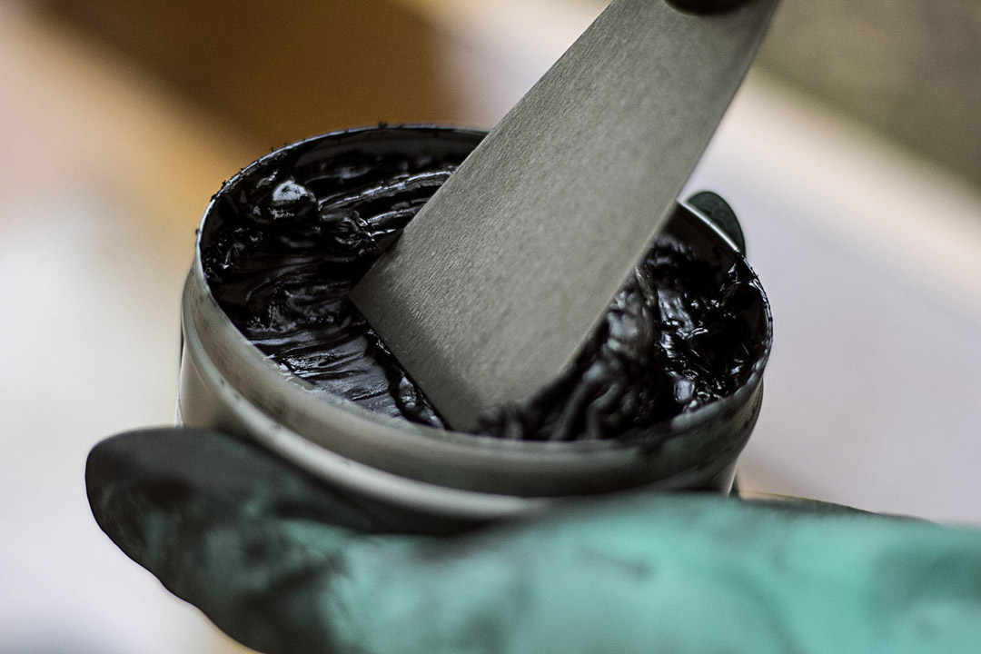 2. Szpachelką nabieramy dedykowaną farbę, lepką, gęstą, o charakterystycznym zapachu